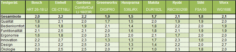 Unser Fazit: So unterschiedlich die Trimmer und Sensen auch sind, unsere Tester waren mit allen Geräten mehr oder weniger gleichermaßen zufrieden. Daher lautet das Testurteil für alle „gut“.