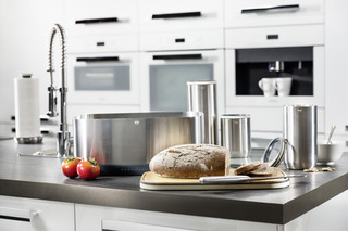 Sie besteht aus Vorratsdosen, einem Küchenrollenhalter und einem Brotkasten. Die lebensmittelechten und spülmaschinengeeigneten Vorratsdosen gibt es in drei Größen. Der Deckel ist wahlweise mit praktischem Sichtfenster aus Kunststoff erhältlich. Das Herzstück der Serie ist der Brotkasten aus rostfrei gebürstetem Edelstahl mit Anti-Rutsch-Ring und abgerundeten Ecken. Er hat Belüftungslöcher und einen dicht schließenden Deckel aus Gummibaumholz mit Kunststoffrahmen. Diesen Deckel können Sie auch als Schneidebrett verwenden. Das helle und pflegeleichte Holz bildet optisch einen schönen Kontrast zum kalten Edelstahl.