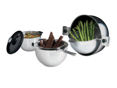Das Kochgeschirr Balancia von Mastrad ist ein sehr vielseitiges System, das Ihnen die Arbeit in der Küche erleichtern wird. Es besteht aus drei Kochtöpfen in unterschiedlichen Größen, die für alle Herdarten geeignet sind. Alle haben einen passenden Glasdeckel mit dicht schließendem Silikonrand und einem silikonummantelten Griff. Die zwei kurzen Griffe werden jeweils in die Laschen der Kochtöpfe eingeklinkt. In den größten Topf können Sie ein Sieb einhängen. So können Sie beispielsweise Pasta direkt im Sieb kochen. Beim Kippen des Topfes bleibt das Sieb übrigens horizontal. Mit dem gleichen Prinzip können Sie in den mittelgroßen Topf ein Wasserbad einhängen und so zum Beispiel Schokolade schmelzen, ohne die Schüssel danach aus dem Wasser fischen zu müssen.
