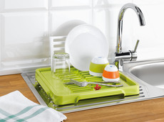Damit Sie nach dem Spülen Ihr nasses Geschirr nicht irgendwo hinstellen müssen, hat Koziol das Abtropfgestell Dry It im Sortiment. Es ist eine besondere Abtropfzone für den kleinen Abwasch und sorgt für mehr Platz neben der Spüle. Dank des klappbaren Stützbügels an der Kante können Sie auch große Essteller sicher zum Trocknen aufstellen. Das Material ist oberflächenschonend und die Rillenstruktur sorgt für guten Halt des Geschirrs. Durch die leichte Neigung fließt das Tropfwasser nach vorne und sammelt sind über der integrierten Abflussöffnung. Dort läuft das Wasser über den Rand der Spüle ab.