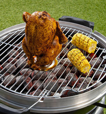 Beim Hähnchenhalter können Sie in den innenliegenden Behälter Marinaden, Wein oder Bier gießen. Die Flüssigkeit verdampft während des Garens und sorgt für ein tolles Aroma.