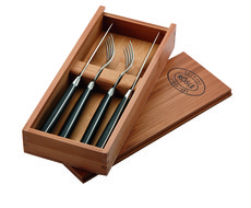 Die Griffe aus hochwertigem Kunststoff sind ergonomisch geformt. Drei Nieten schaffen eine sichere Verbindung zwischen Klinge und Zinken. Der Kropf zwischen Klinge und Griff bietet guten Schnittschutz. Für besseren Halt ist die Gabel vierzinkig gestaltet. Aufbewahren können Sie das Besteck in dem schön gearbeiteten Holzkasten, in dem das Besteck verkauft wird.