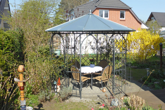 Den lauen Sommerabend bei einem Gläschen Wein genießen, ein Sonnenbad nehmen oder mit Freunden feiern: Im eigenen Garten kann man sich vom Alltagsstress erholen und die Natur genießen. Mediterrane Pflanzen wie Oleander, Orangenbäumchen oder auch duftende Rosen sorgen für Urlaubsstimmung pur. Einen Hauch von Romantik kann man dieser Wohlfühloase beispielsweise mit einem Gartenpavillon aus Metall verleihen. Das nostalgische Schmuckstück ist nicht nur eine elegante Kletterhilfe für Clematis, Geißblatt, Kletterrosen und Co., sondern auch der ideale Platz, um zur Ruhe zu kommen.
