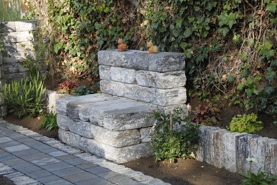 Eine Bank fürs Leben lautete das Ziel für dieses Projekt. Stabil sollte sie sein und möglichst lange halten. Zunächst haben wir die mögliche Grundfläche der Bank ausgelegt, um ein Gefühl für die Dimension zu bekommen. Die Vermont Bruchsteinmauer-Elemente haben ein Format von 50 x 25 x 15 cm bzw. 25 x 25 x 15 cm. Wir haben dreiseitig gebrochene und gekollerte Endelemente eingesetzt. Die sichtbaren Oberflächen sind kugelgestrahlte Abdecksteine.
