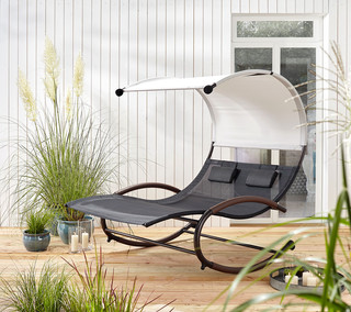Ebenfalls ein Highlight im Garten ist die Schwingliege Coral von Dehner. Auf der Liege für zwei Personen können Sie beim Sonnenbaden oder Lesen sanft Hin- und Herschaukeln. Gesundheitsexperten zeigen, dass sanftes schaukeln besonders beruhigend wirkt und die Entspannung fördert. Für zusätzlichen Komfort ist die Liege mit einem Sonnendach ausgestattet, das im Winkel verstellt werden kann. Die besondere Sitzgelegenheit sieht nicht nur schick aus, sondern ist auch sehr robust. Die Liegefläche besteht aus Textilene, einem elastischen und wetterfestem Material, dass sich der Körperform anpasst. Die beiden mit Schaumstoff gefüllten Kopfkissen sind ebenfalls wasserfest und schnell trocknen. Auch ein kleines Sommergewitter macht dem Möbelstück daher nichts aus.