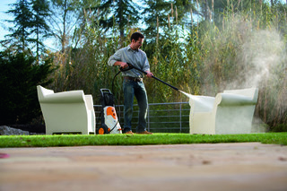 Wenn der Schmutz so hartnäckig ist, dass die sanften Reinigungsmittel nichts mehr ausrichten können, ist - je nach Material - der Hochdruckreiniger das Mittel der Wahl. Der Re 163 Plus von Stihl punktet mit einigen Besonderheiten wie dem Manometer. Damit können sowohl der Druck als auch die Wassermenge an die jeweilige Situation angepasst werden. Das spart Wasser und schont ihre Gartenmöbel. Der Reinigungsmitteltank ist platzsparend in das Gehäuse des Geräts integriert und kann zum Befüllen oder Auswaschen einfach herausgenommen werden. Mit der Rotordrüse können punktuell hartnäckige Flecken entfernt werden, während die Flachstrahldrüse größere Flächen schnell und effektiv reinigt.