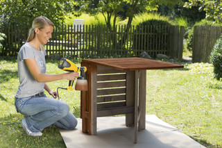 Holz sollte nach der gründlichen Reinigung mit einem Holzschutzmittel behandelt werden, damit es durch die Witterung keinen Schaden nimmt. Öle und Lasuren halten die Feuchtigkeit davon ab, ins Holz einzudringen. So bleiben Terrasse oder Gartenbank länger schön. Der Auftrag des Holzschutzes kann jedoch viel Zeit in Anspruch nehmen. Mit einem Sprühsystem für Lacke und Lasuren oder einem Universalsprühgerät, zum Beispiel die Wagner W 590 Flexio, ist die Arbeit bis zu sechsmal schneller erledigt. Das Gerät trägt Öle und Lasuren gleichmäßig auf - ohne Materialverschwendung.