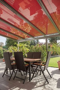 Die Beschattung des Terrassendachs ist ein wichtiger Punkt, tropische Stauhitze an wärmeren Tagen will schließlich niemand haben. Sinnvoll ist es, eine Unterglasmarkise zu montieren - so bleibt der Stoff vor Schmutz und Feuchte gut geschützt. Das Tuch kann je nach Stand der Sonne individuell ein- oder ausgefahren werden. Farblich lässt sich eine solche Markise auf den Hausstil oder die Terrassenmöbel abstimmen. Im Gegensatz zur außen liegenden Beschattung benötigt eine Innenmarkise keinen Wetterwächter, dessen automatische Steuerung die Markise abhängig von Helligkeit, Temperatur, Wind und Niederschlag ein- und ausfährt.