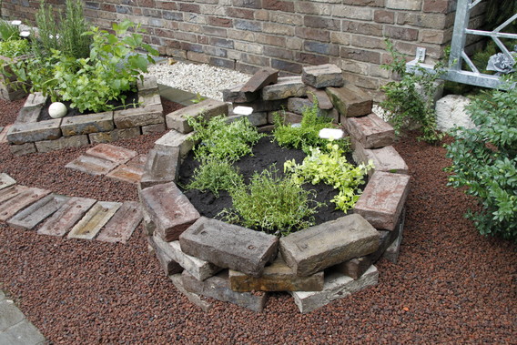 Steht nicht viel Platz für die Anlage eines Kräuterbeets zur Verfügung, bot bisher die Kräuterspirale, die der Kräuterfülle auf engem Raum den jeweils richtigen Standort zuweist, die Lösung. Wir haben aus übrig gebliebenen Klinkersteinen einmal eine andere Form gebaut, die an eine alte Burganlage erinnern soll.