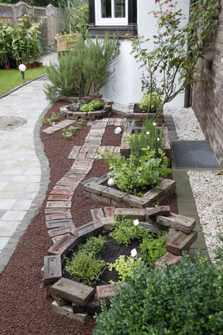 Jeder Block erhält eine eigene Gruppe von Kräutern. Daneben hat ein Rosenstämmchen seinen Platz gefunden. Damit die Blöcke problemlos erreicht werden können, haben wir dazwischen die alten Klinker als Miniweg eingesetzt. So kommt die Familie trockenen Fußes an ihre würzigen und aromatischen Kräutermischungen.