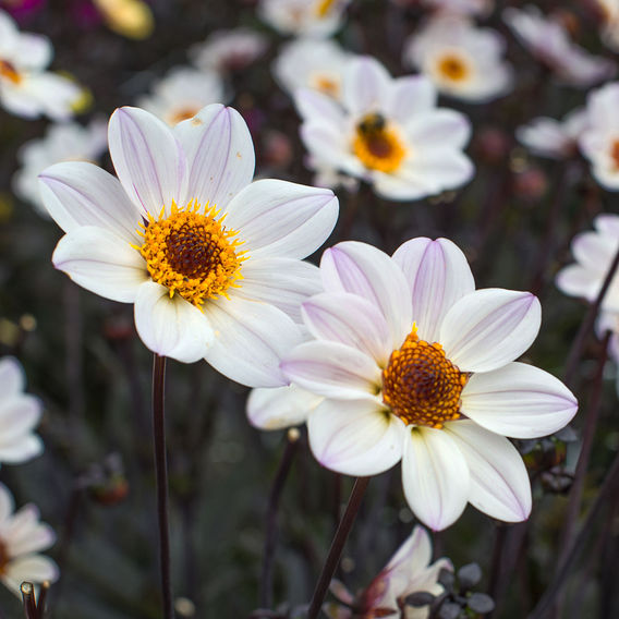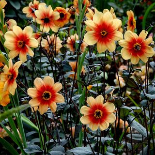 Ein dieser bezaubernd kleinen Dahlien ist 'Happy Single Princess'. Sie bildet mit ihren dunklen, fast schwarzen Blättern einen spannenden Kontrast zu den schneeweißen, leicht violett schimmernden Blüten. „Mit ihrem leuchtenden Gelb in der Mitte zieht sie dann endgültig sämtliche Blicke auf sich", schwärmt van der Veek. Alle Dahlien der Serie Happy Single sind üppig blühende, farbenfrohe Sommerblumen. Wären da nicht die typisch dunklen Blätter, würden sie stark an Margeriten erinnern. Eine sommerlich warme Farbe bietet die Dahlie 'Happy Single First Love'.