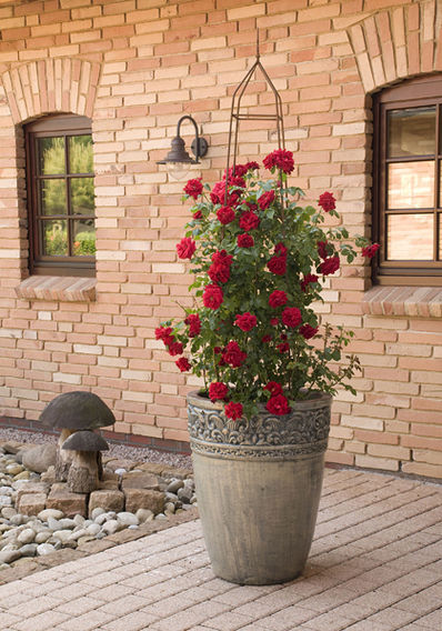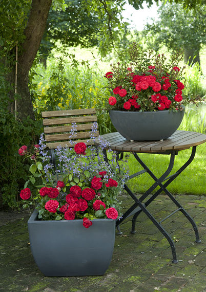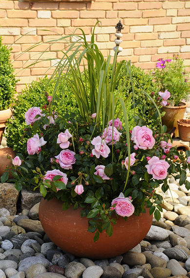 Im Prinzip eignen sich alle Gartenrosen für große Pflanzgefäße. Natürlich bieten sich für „Rosenverrückte" die besonders reich blühenden Sorten mit einem harmonischen Wuchsbild an. Hier wird man auf jeden Fall im Sortiment der Beetrosen (z.B. ´Garden of Roses´, ´Rosenfee´) oder Zwergrosen (z.B. ´Pepita, ´Roxy´, ´Zwergenfee 09´, ´Out of Rosenheim´) fündig. Diese blühen bis zum Frost immer wieder und zeigen sich selten ganz ohne Farbe. Auch mit Sorten aus der Gruppe der Kleinstrauchrosen (z.B. ´Escimo´, ´Knirps´) kann man #B[attraktive Kompositionen} in Pflanzkübeln gestalten, da diese mit ihrem meist breitbuschigen Wuchs reizvoll über den Topfrand hängen.