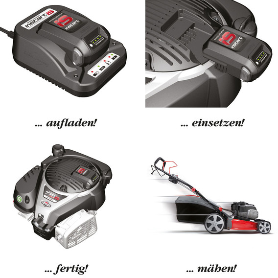 Der Motorenhersteller Briggs & Stratton beispielsweise hat eine clevere Technologie entwickelt, die den Benzinmotor auf Knopfdruck anspringen lässt. Die Energie für den sogenannten InStart-Vorgang kommt dabei aus einem Lithium-Ionen-Akku, der direkt in einem Einschub auf dem Motorgehäuse des Rasenmähers befestigt ist. Voll aufgeladen, reicht seine Energie für über 50 Startvorgänge. Selbst wenn der Akku einmal länger lagert, muss man keinen sogenannten Memory-Effekt oder eine nennenswerte Selbstentladung fürchten.